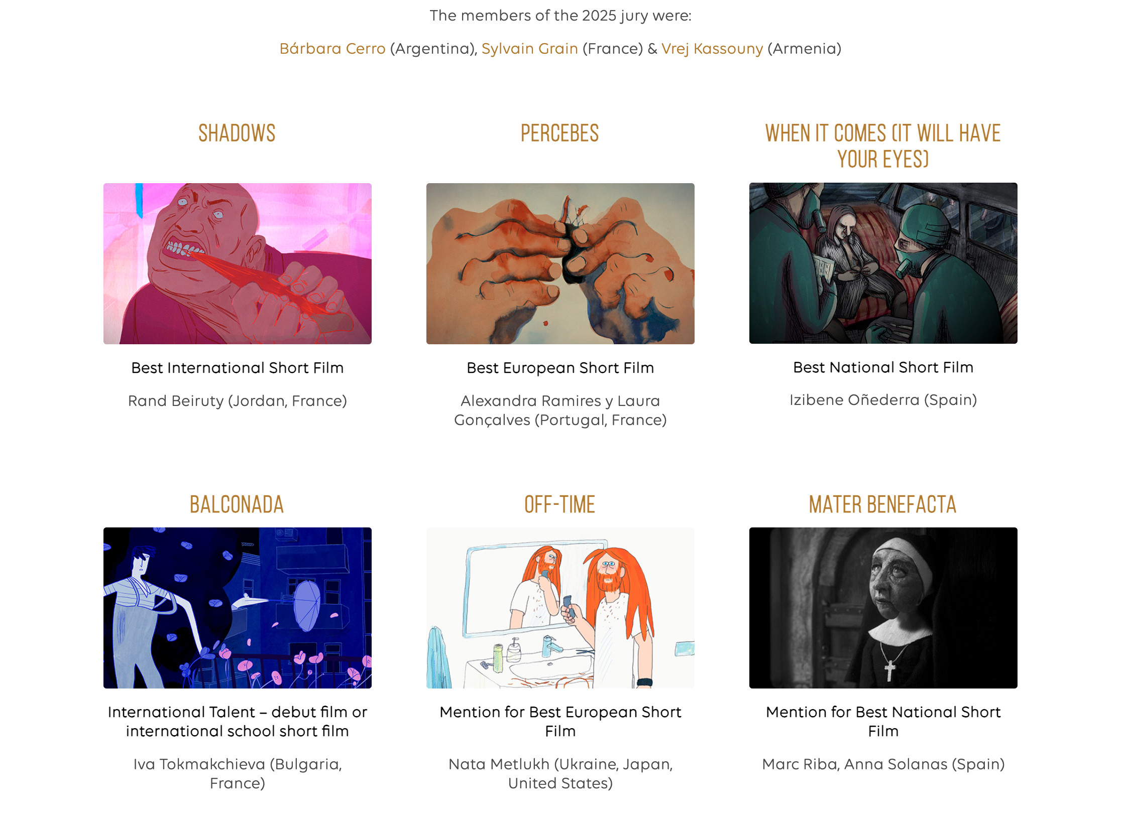 For the 17th edition of the festival the jury consisting of - independent filmmaker Bárbara Cerro, producer and pitching consultant Sylvain Grain, filmmaker and cartoonist Vrej Kassournel - has awarded the International Talent Award to the short animated film BALCONADA.